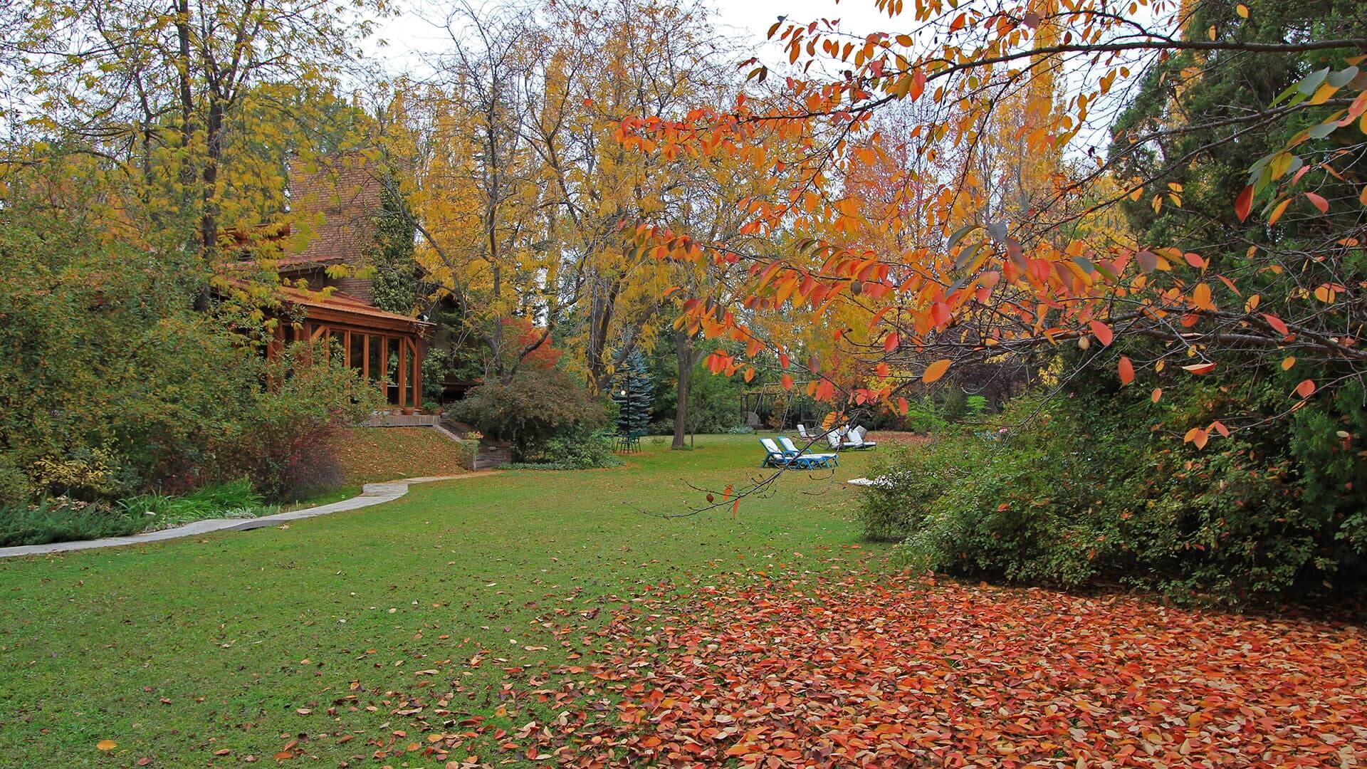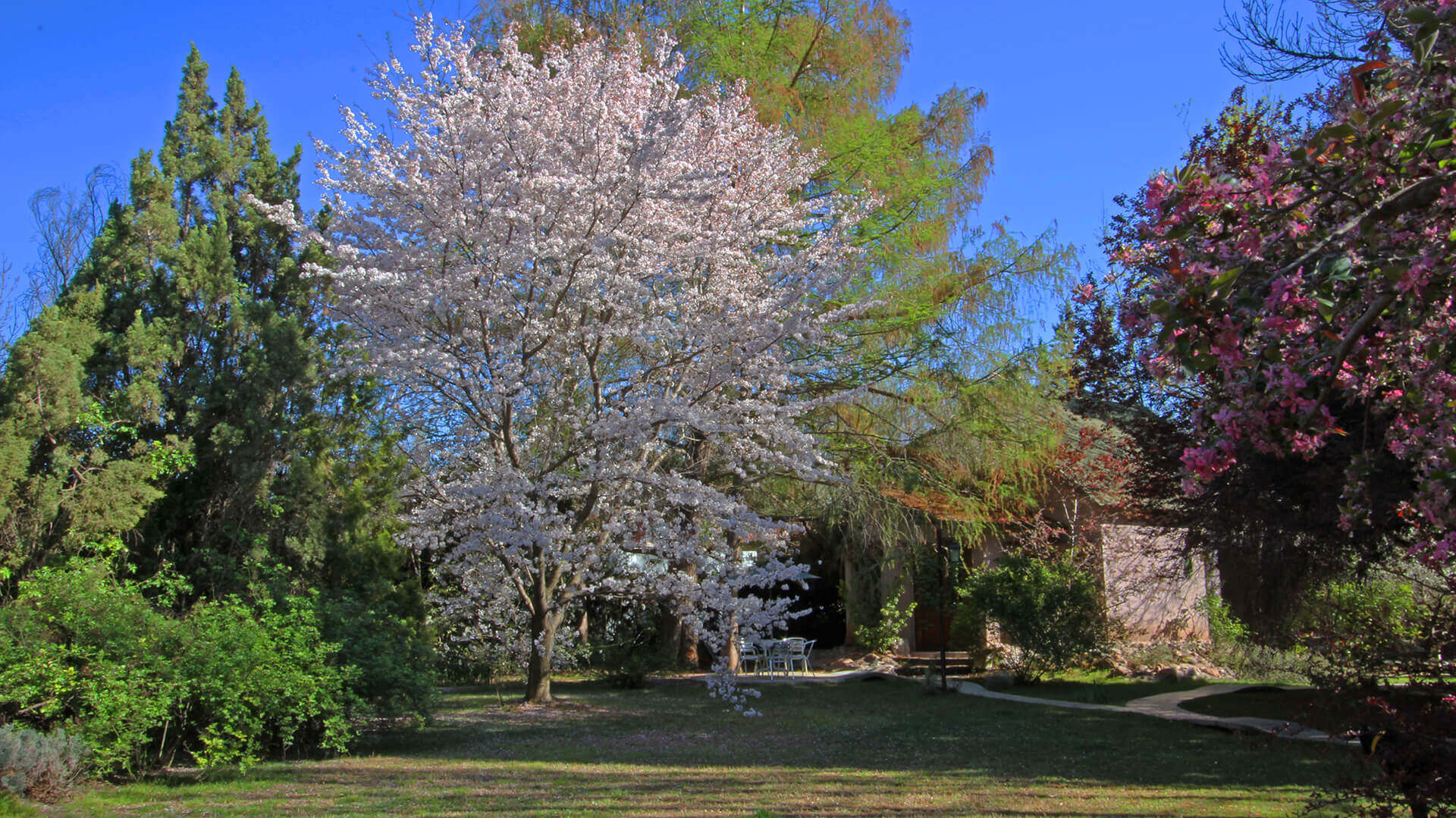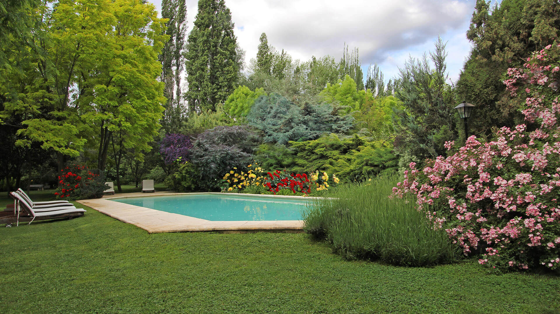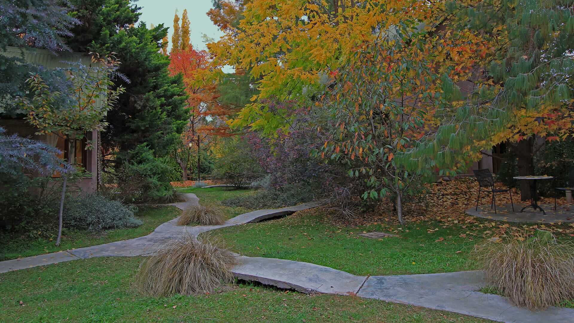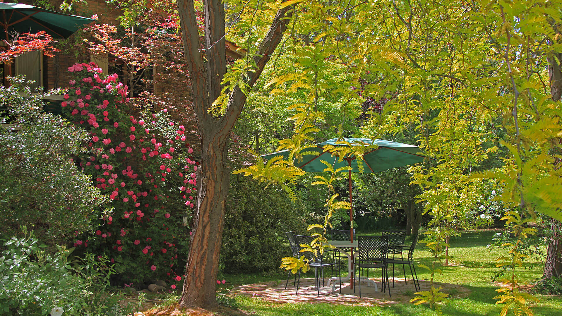 O jardim de 7.000 m2 foi projetado e construído pelos proprietários do hotel, os quais continuam esta atividade com dedicação e paixão desde seu início em 1982. O valor que orienta seu trabalho é o logro da harmonia de formas, cores e aromas em todo momento. Suas mais de 300 árvores, cuidadosamente escolhidas e distribuídas para obtenção de um efeito natural, incluem 50 frutíferas de variedades tipicamente cultivadas na região: macieiras, cerejeiras, pereiras, pessegueiros, nogueiras, aveleiras e outras espécies. Os frutos podem ser livremente consumidos pelos hóspedes ao pé da árvore e formam a base das geleias caseiras que são servidas no café da manhã. Numerosos arbustos, plantas menores e algumas coleções trazidas da França enriquecem o lugar. Os recantos íntimos e perfumados pela vegetação que circunda as acomodações, geram uma sensação de bem-estar, assim como a grande piscina com iluminação noturna emoldurada por generosos zimbros, rosas e lavandas. Tudo convida ao repouso, leitura e prazer estético.